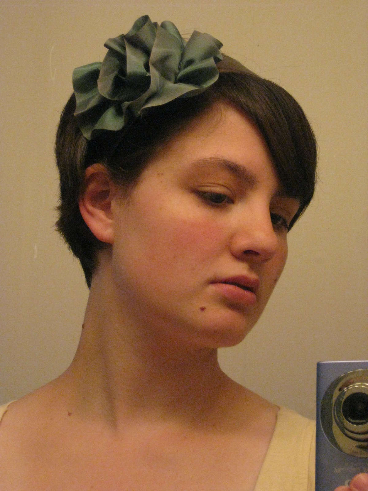 I made this huge rosette out of green hem facing and hot glued it to my favourite brown headband to create my Favourite Headband of All Time.  It took about 15 minutes.  And Harriet slept.